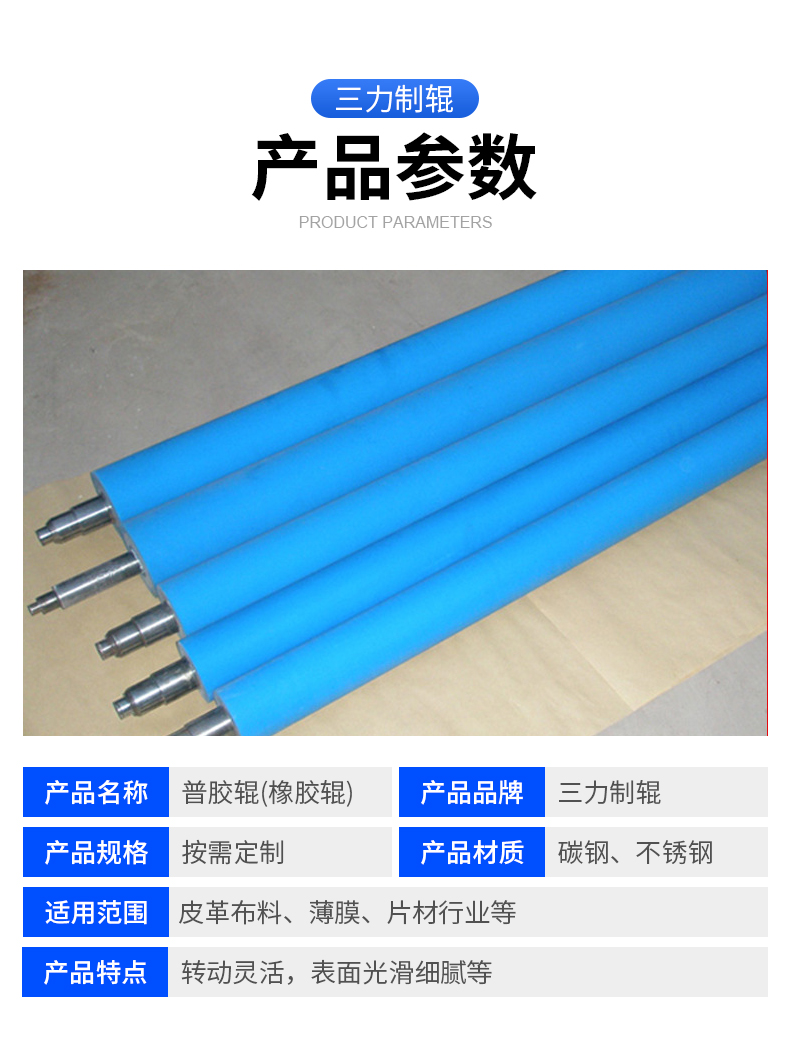 類型 包膠輥 筒直徑 Φ1米內(mm) 壁厚 10-50mm(mm) 軸直徑 按需定制(mm) 筒長度 7米內,按需定制(mm) 三力普膠輥廣泛應用于造紙、印染、印刷、糧食加工、冶金、塑料加工等方面。