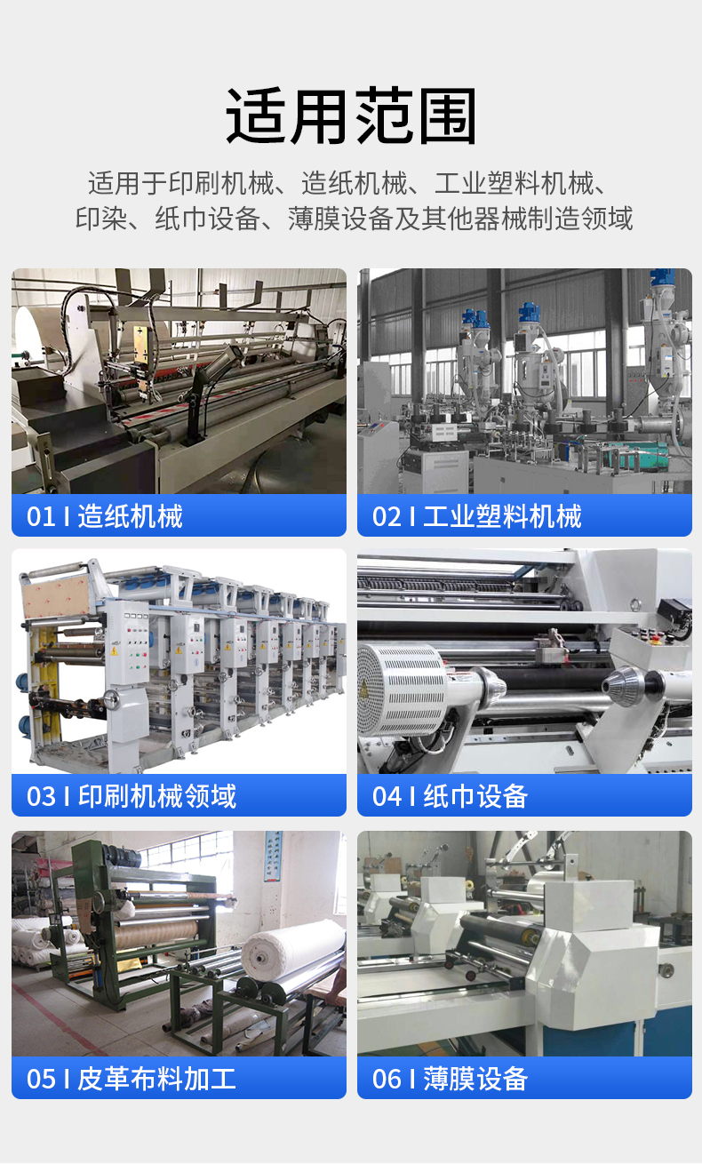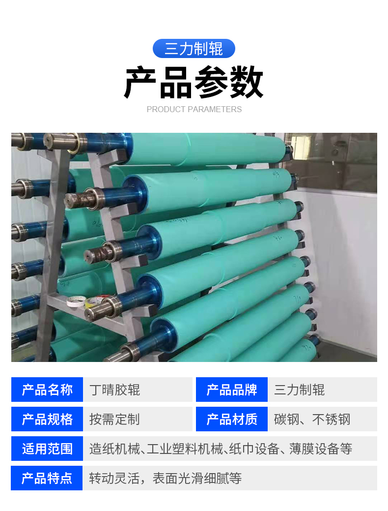 類型 包膠輥 筒直徑 Φ1米內(nèi)(mm) 壁厚 10-50mm(mm) 軸直徑 按需定制(mm) 筒長度 7米內(nèi),按需定制(mm) 筒材料 碳鋼、不銹鋼等 材質(zhì)鐵芯,丁晴膠包覆輥面 表面處理 包膠 適用范圍 應(yīng)用到印刷機械、造紙機械 丁晴膠輥具有優(yōu)良的耐油性,而且耐磨、耐老化、耐熱性能也較好,用于印刷、印染、化纖、造紙、包裝、塑料加工等設(shè)備及其它接觸油及脂肪烴類溶劑的場合。